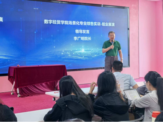 在结营仪式上,数字经贸学院李广明院长首先向所有参与工作坊的同学表示了热烈的祝贺。他充分肯定了本次实训取得的成果,并鼓励师生们积极拥抱数字时代的快速变化,勇于创新,将所学知识转化为解决实际问题的实践能力,为数字贸易产业的繁荣发展贡献自己的智慧与力量。李院长特别勉励同学们:“要珍惜这次难得的学习与实践机会,它不仅是你们简历上的一笔,更是你们职业能力的一次淬炼。希望你们能将实训中的收获内化为自身的核心竞争力,未来在广阔的数字化舞台上大展宏图。”
