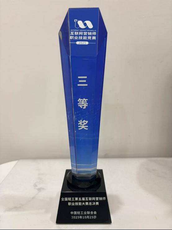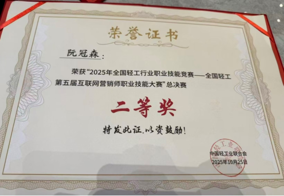 2025年10月25日,2025年全国轻工第五届互联网营销师职业技能大赛总决赛在河北邯郸临漳县圆满闭幕。经广东赛区选拔,由桃花岛电商咨询有限公司数字营销内容创作工作坊推荐参赛的广州华商学院数字经贸学院跨境电子商务系阮冠森同学,凭借扎实的专业能力与创新的实践表现,在“视频创推员学生组”赛道脱颖而出,斩获国家级二等奖;数字经贸学院师慧老师在职工组比拼中表现亮眼,凭借出色的视频创推与直播销售技能,荣获国家级三等奖,为学院赢得双重荣誉。