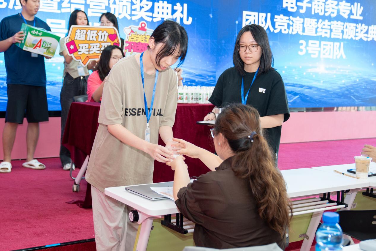 结营仪式的高潮环节是各实训小组的精彩纷呈的路演展示。同学们化身为专业的项目负责人,依次登台,通过充满激情的模拟直播,全面还原了实训成果。他们提交的不仅是亮眼的销售数据或流量增长,更是对市场策略、用户心理和内容创意的深度思考与实战验证。他们在舞台上的自信表达与专业风范,生动地展现了将理论应用于实践的飞跃,赢得了校企导师的频频赞许。